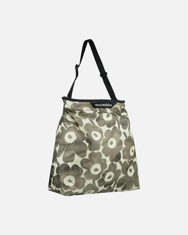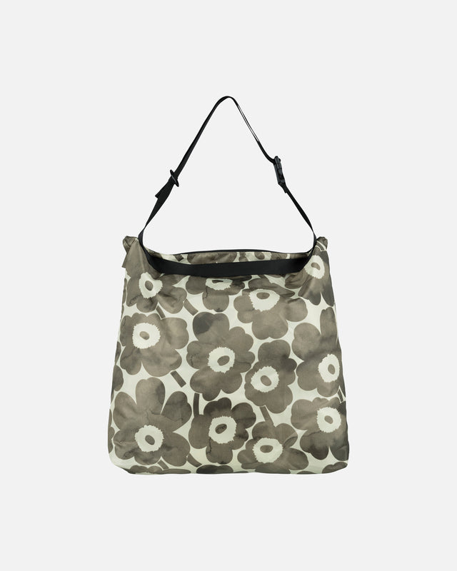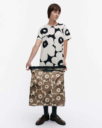 The Neat Crossbody L shoulder bag is made of recycled polyester in the Unikko pattern. The bag has an adjustable shoulder strap that is made of recycled polyamide. The bag has a zipper closure, the Marimekko label on the front, and a slip-in pocket on the inside where the whole bag can be folded away for easy storage.