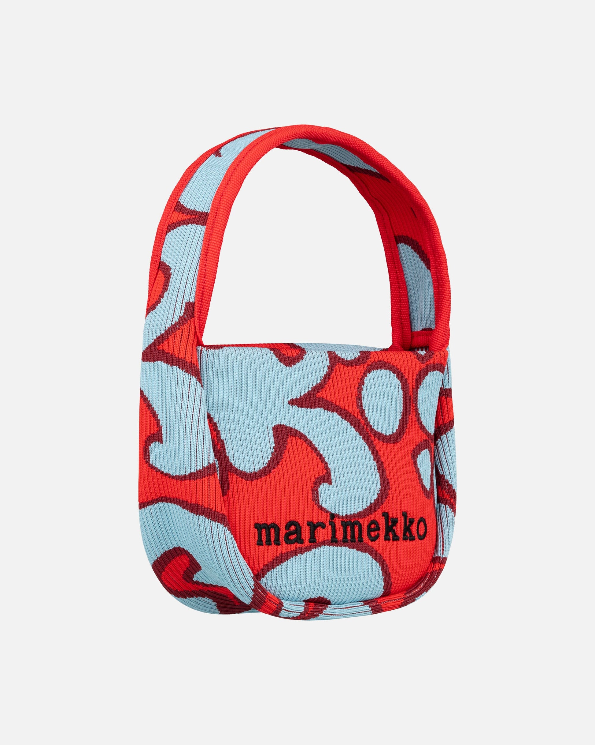 The Knitted Mini Handbag features the jacquard knit Keidas pattern. The firm bag has a ribbed look, a handle, a zipper closure, and the embroidered Marimekko logo on the front.