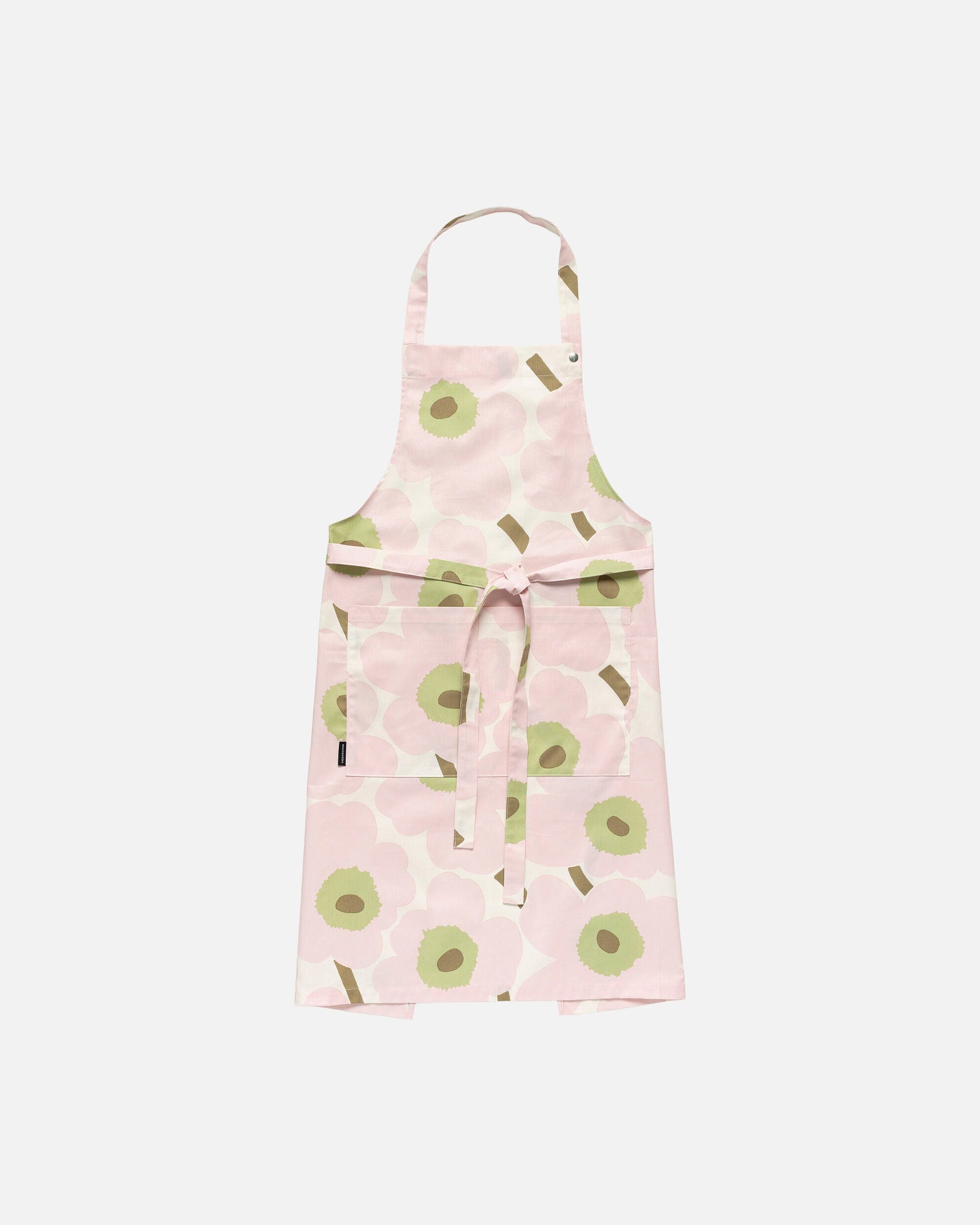 The Pieni Unikko pattern apron is printed in Helsinki. The apron has a front pocket and an adjustable neck band.
