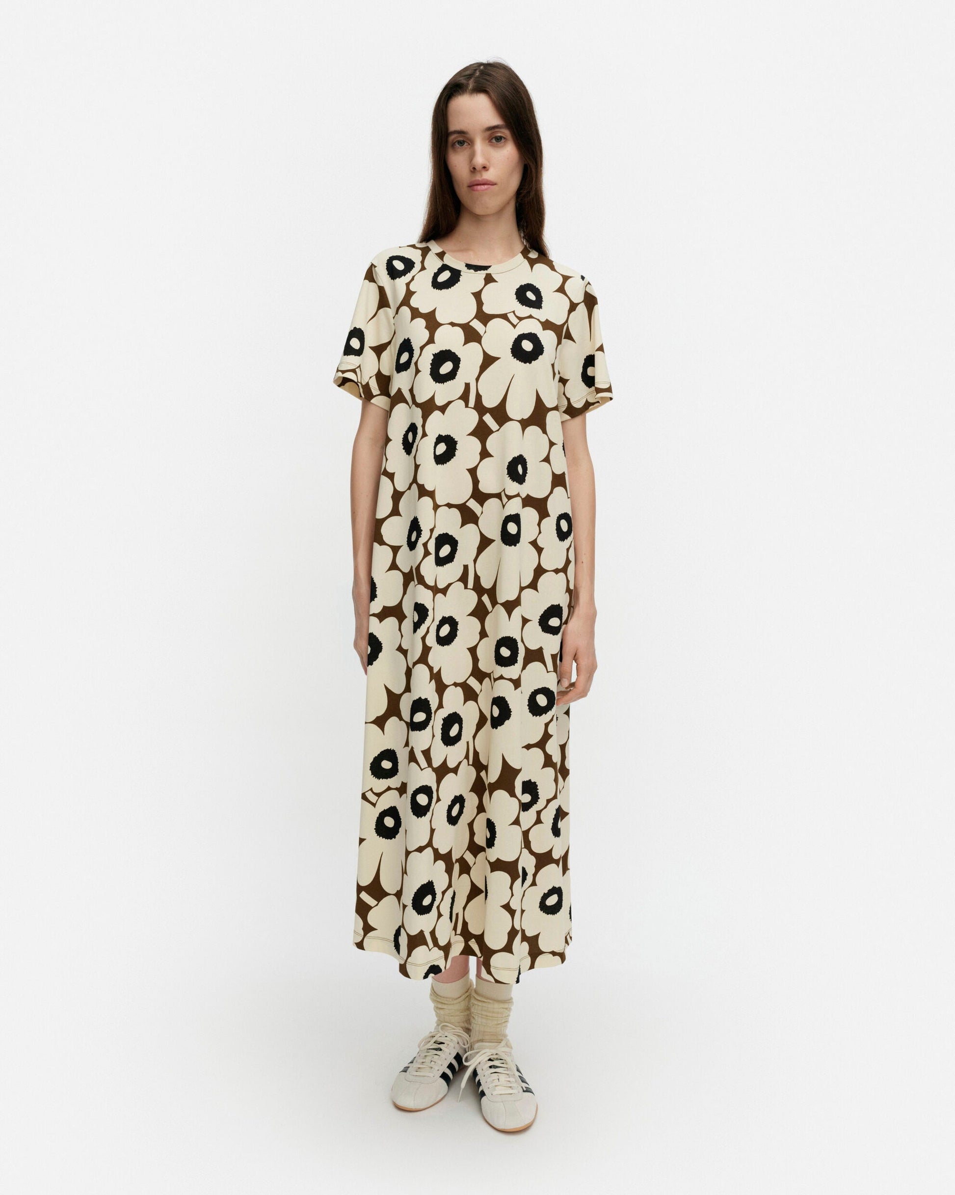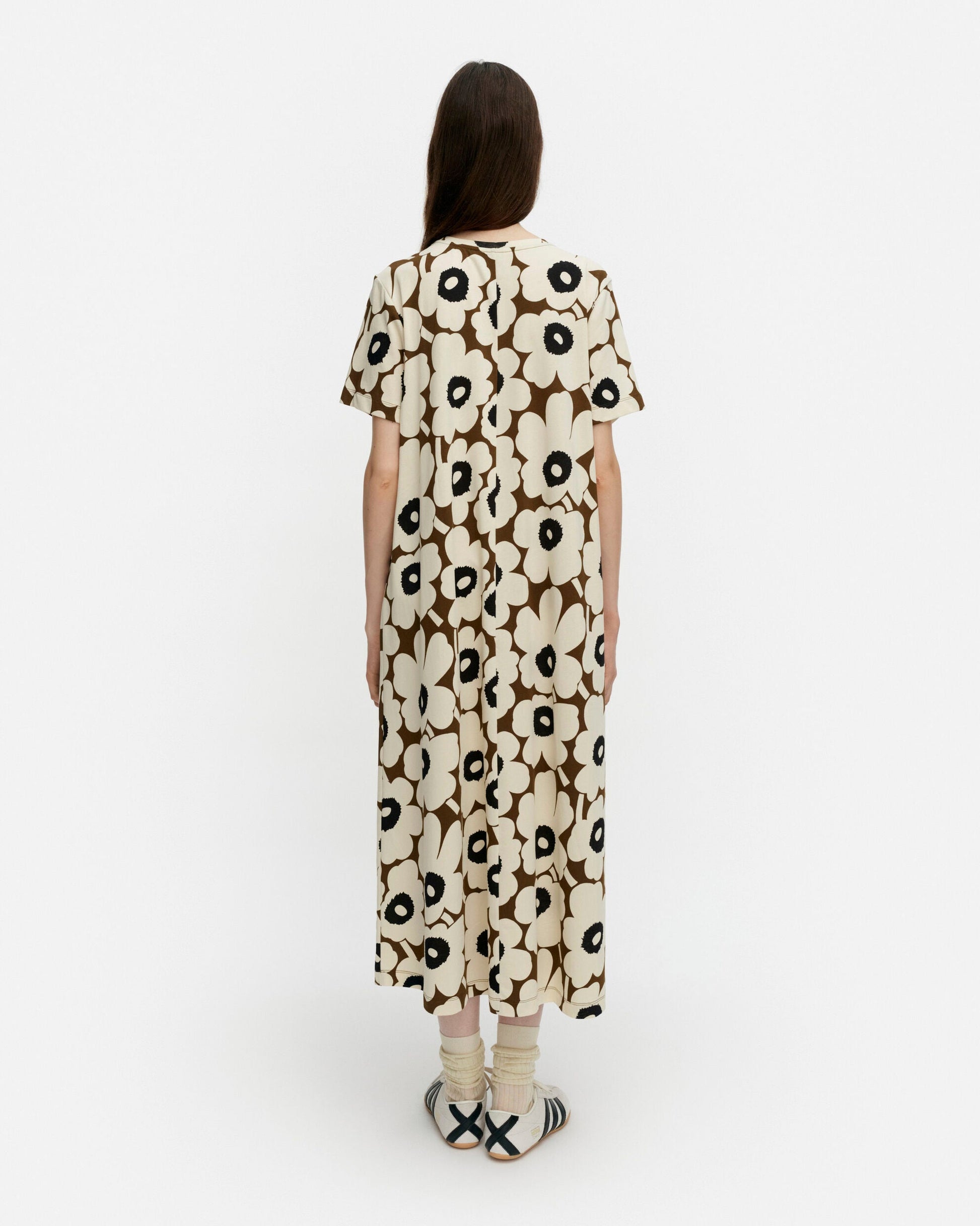 The Pisteinen t-shirt dress is made of cotton jersey and it has a slim, A-line fit. The dress features the Unikko pattern, an O-neck with a self-fabric finish, and a central seam in the back.