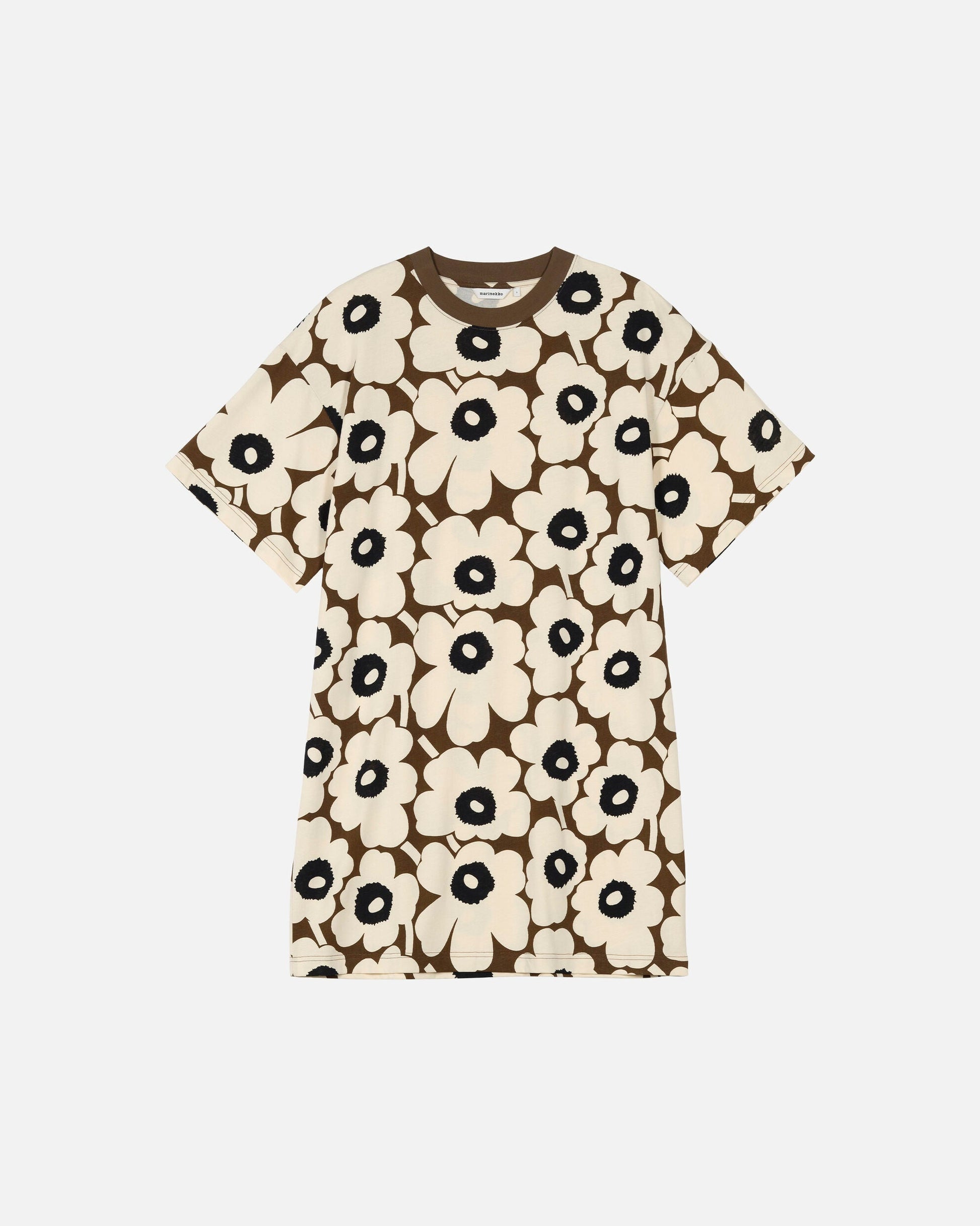 The Palikka t-shirt dress has an oversized, straight fit. The dress features the Unikko pattern, a ribbed O-neck, and short sleeves that are dropped at the shoulders.