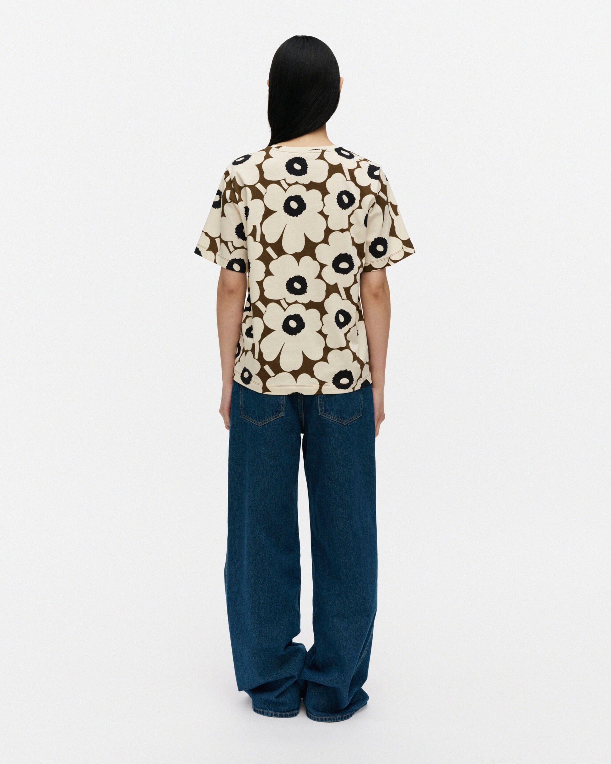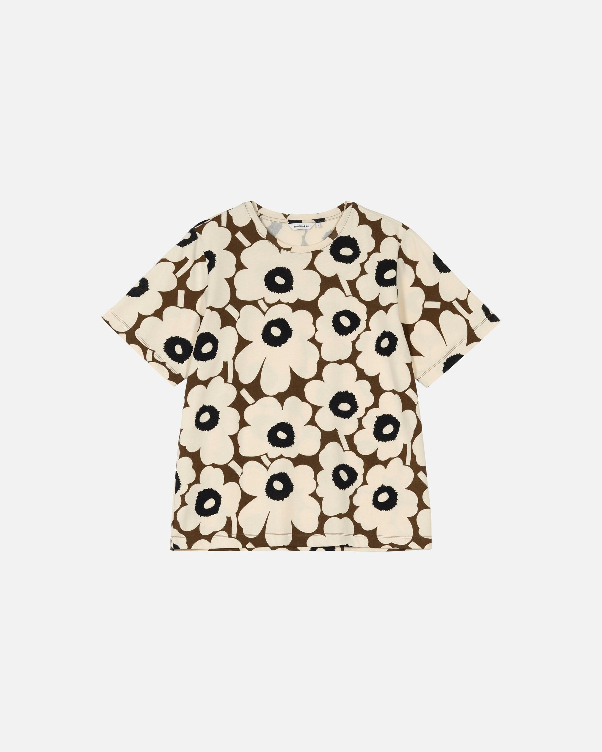 The Tunnit t-shirt is made of cotton jersey and it has a relaxed, straight fit. The t-shirt features the Unikko pattern and an O-neck with a self-fabric finish.