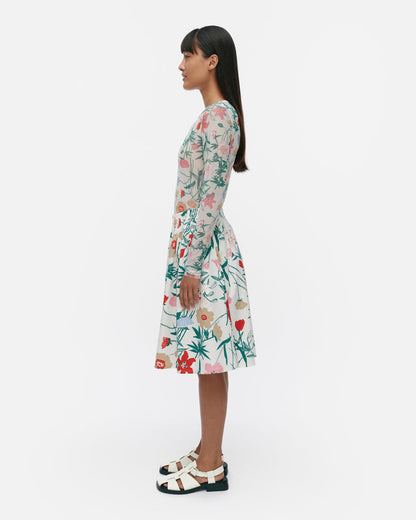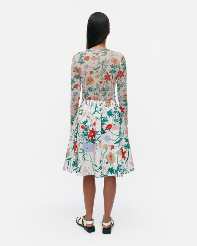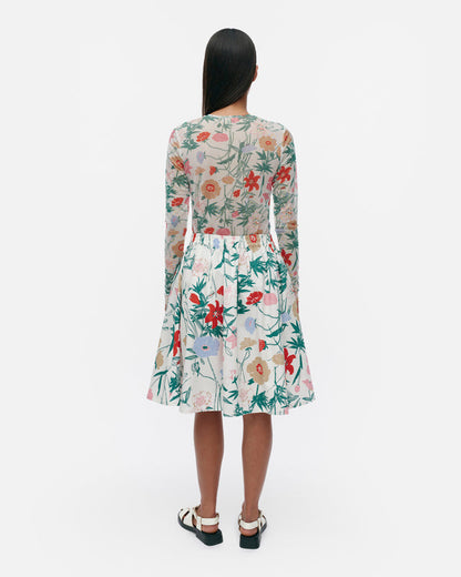 The Poiminnot skirt is made of organic cotton twill, and it has a relaxed, A-line fit. The skirt features the Perenna pattern, which is printed in Helsinki. The product contains 4% elastane. The skirt has an elastic waistband and side seam pockets.