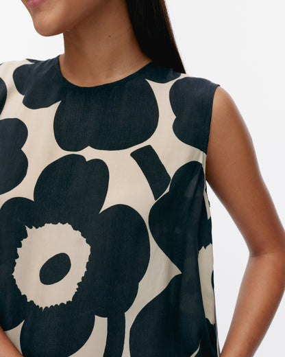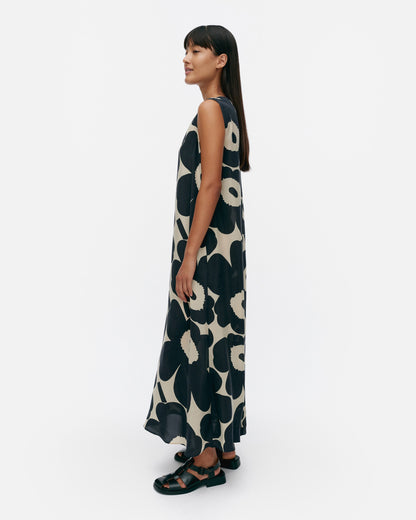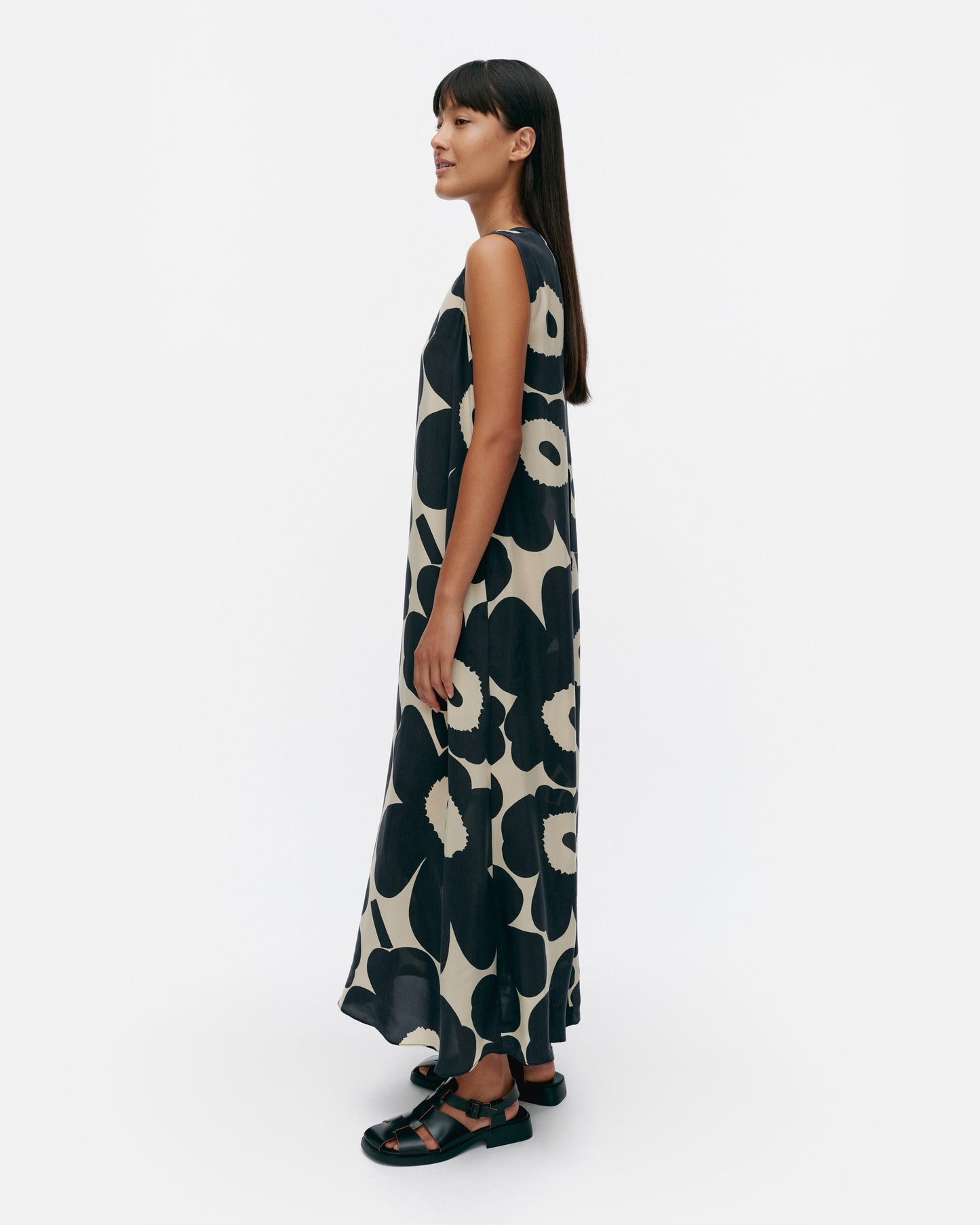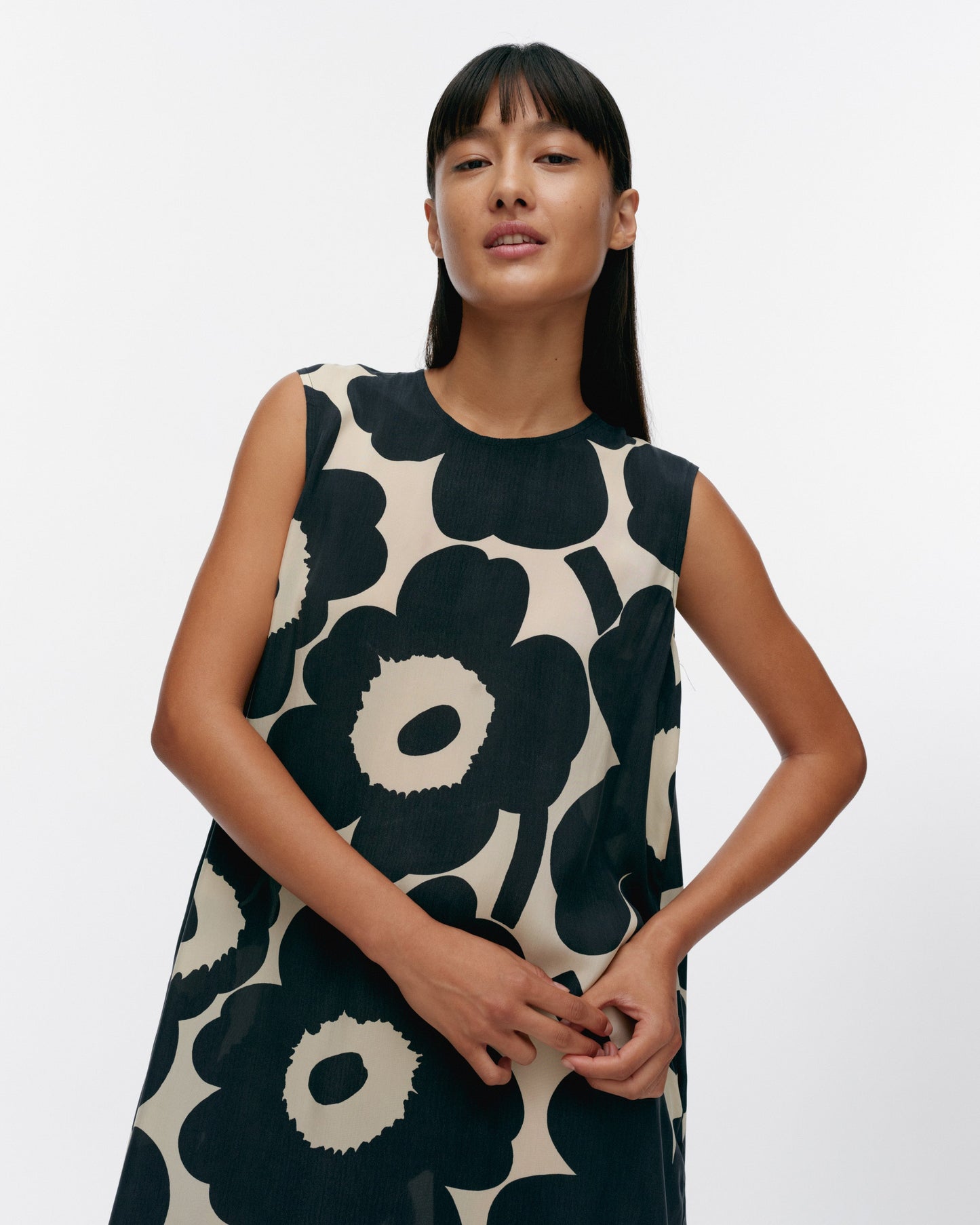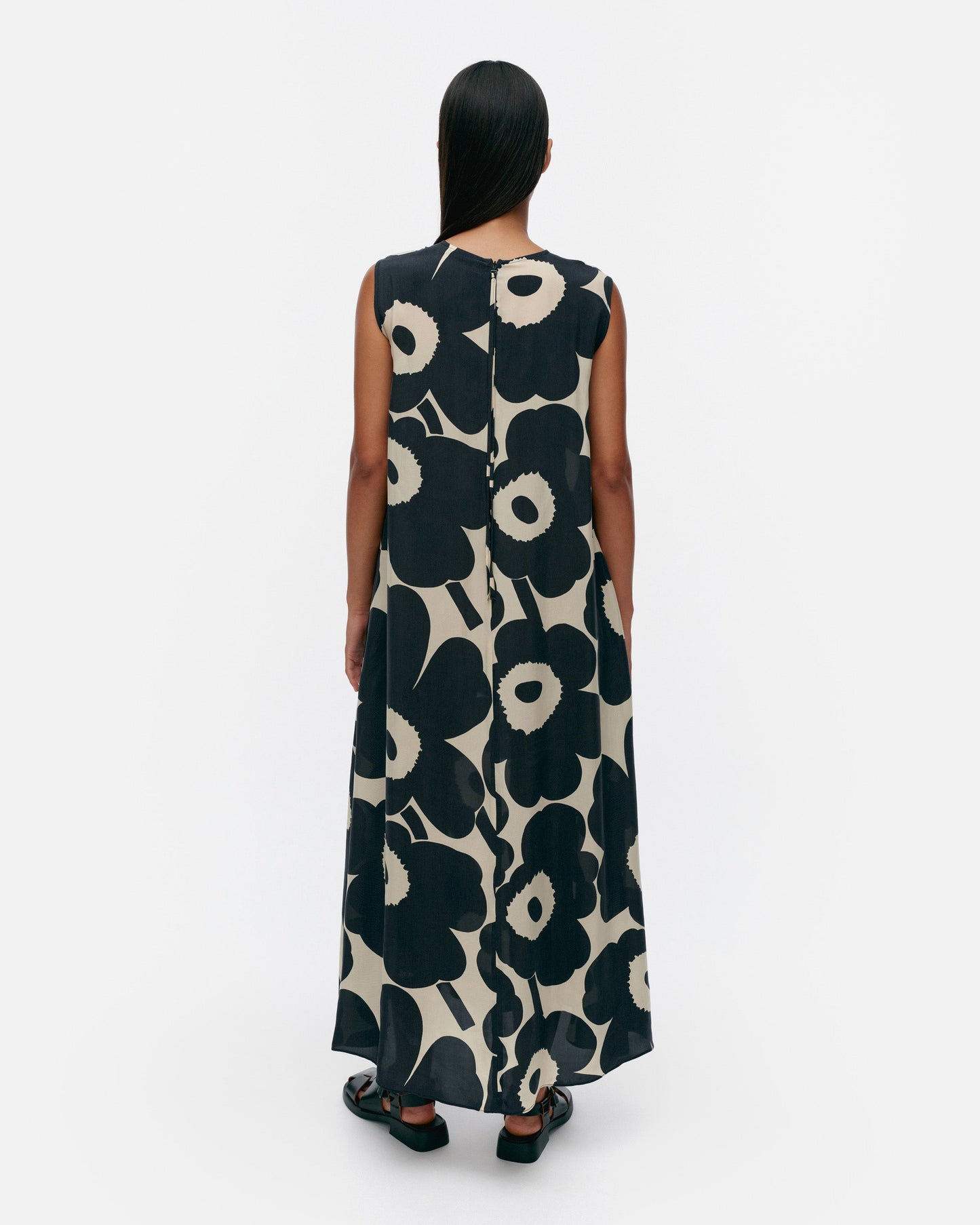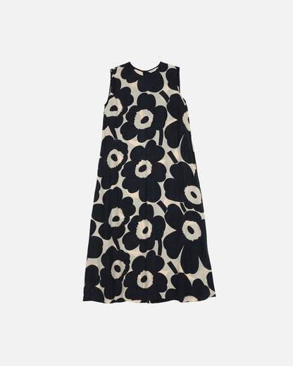 The Migot cupro dress has a slim, A-line fit and it is printed in the Unikko pattern. The sleeveless dress has a concealed zipper with long ribbon pullers at the back neckline and pockets at the side seams.