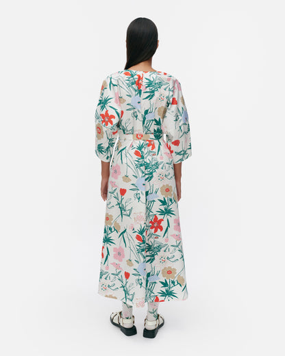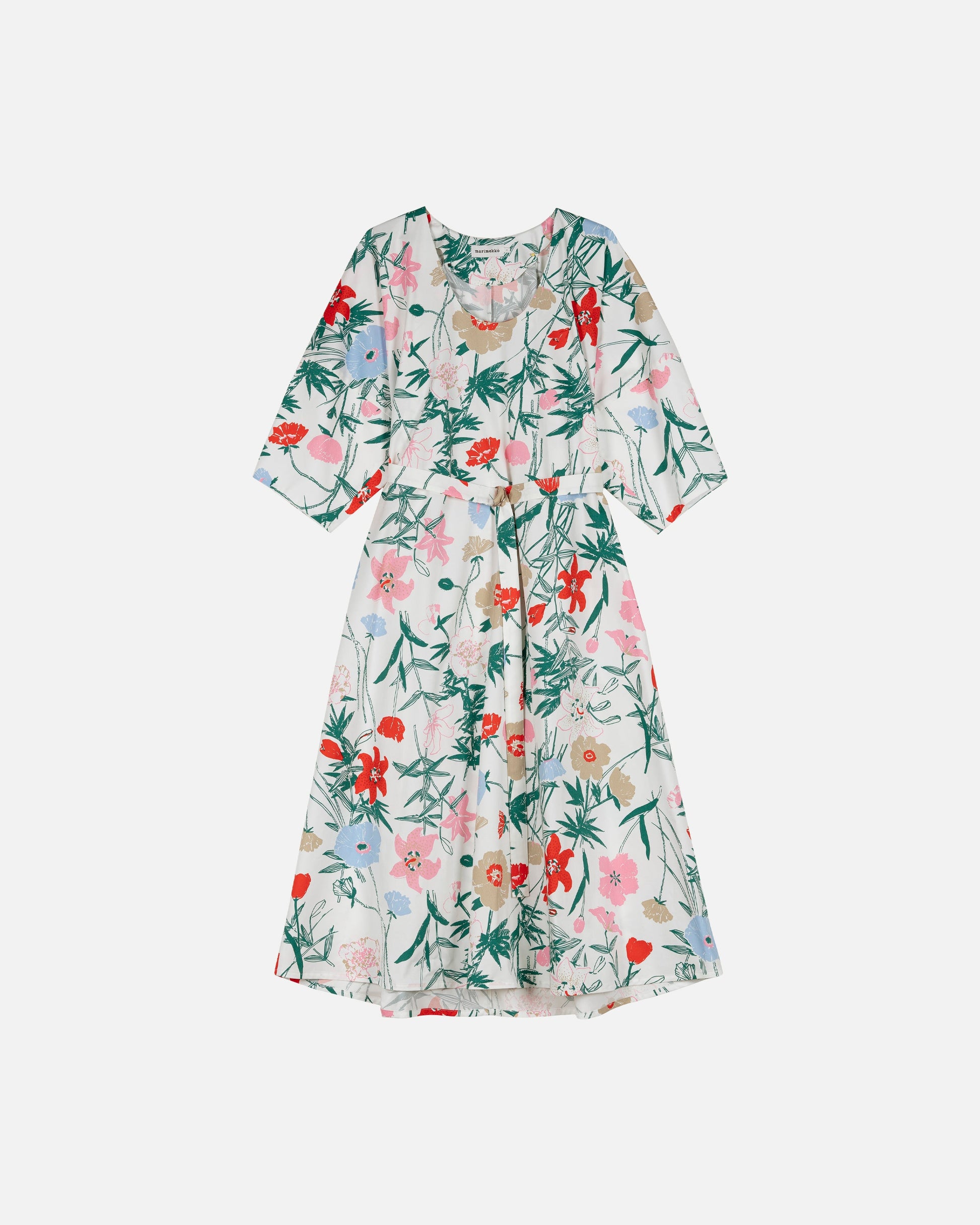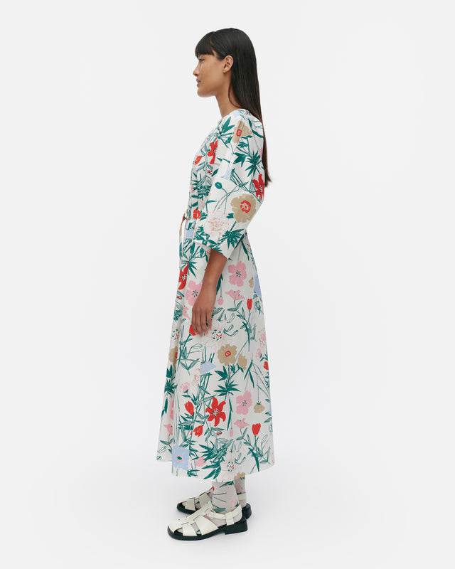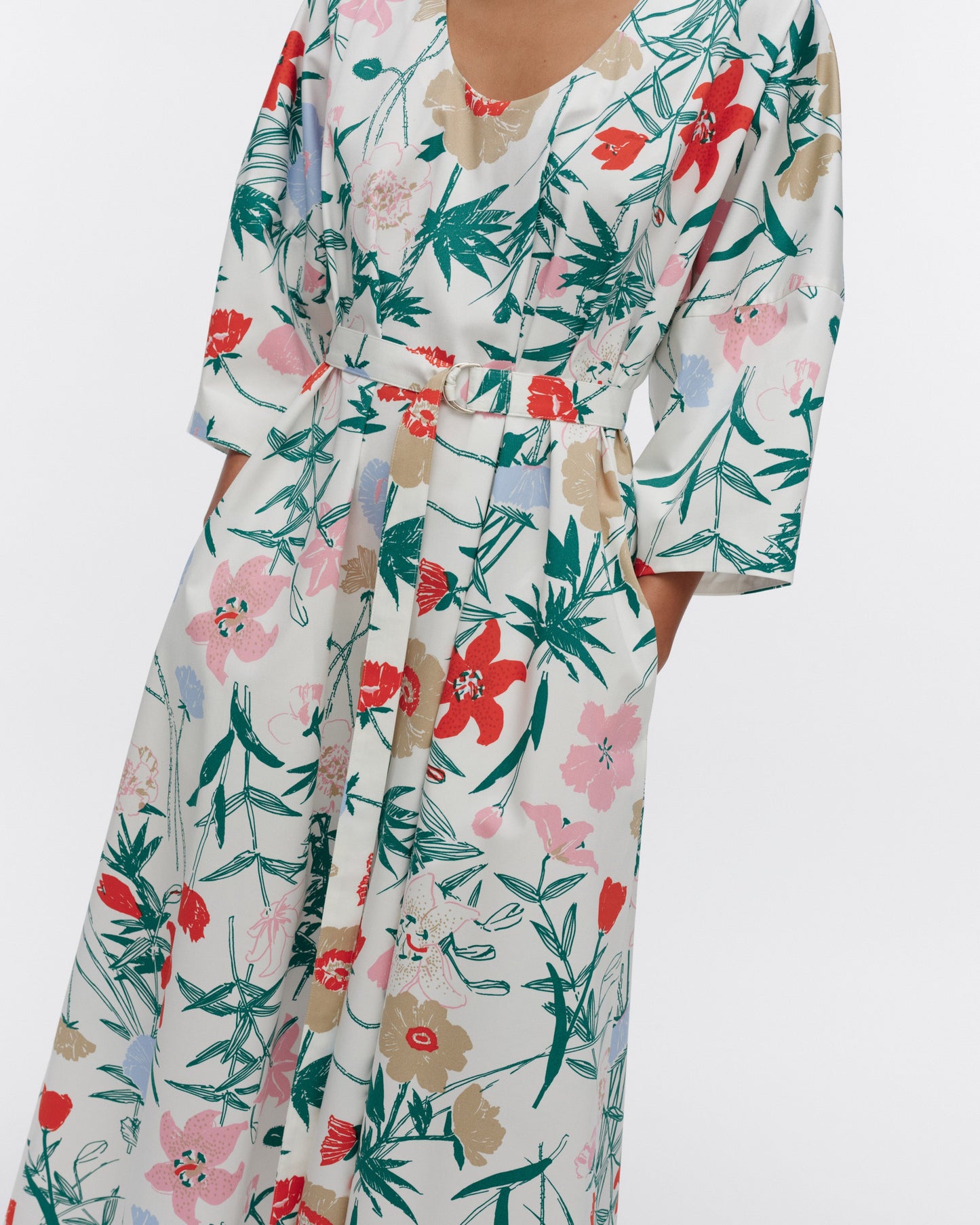 The Hymy dress is made of organic cotton twill, and it has a relaxed fit, a straight top, and a flared cut hem. The product contains 4% elastane. The dress features the Perenna pattern, which is printed in Helsinki. It has a scoop neck and cropped kimono sleeves with a rounded shape and wide turn-ups at the cuffs. There are pockets in the side seams and the dress comes with a separate D-ring belt.