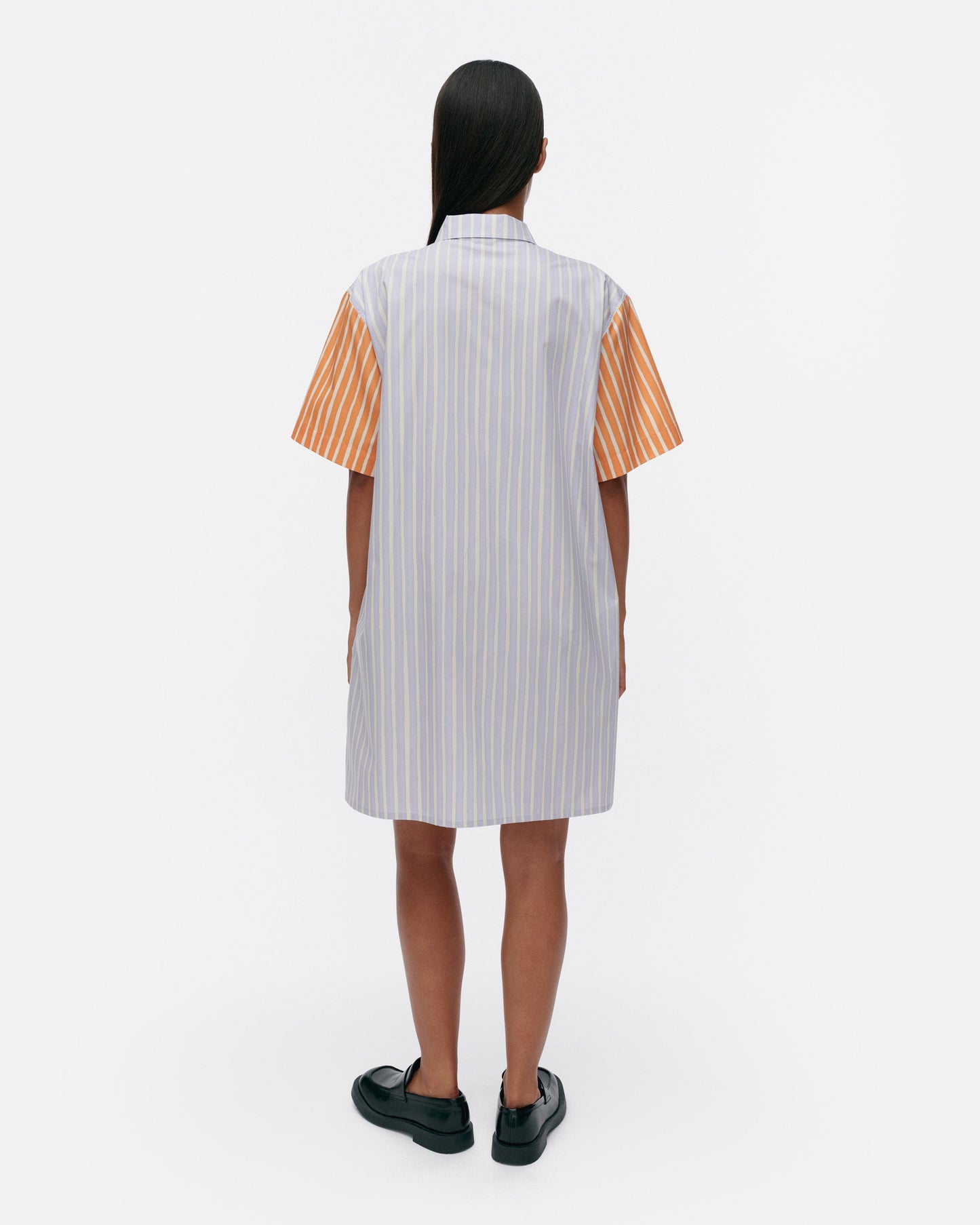 The Jokapoika shirt dress is made of organic cotton, and it has a relaxed, straight fit. The dress features the Piccolo pattern, which is printed in Helsinki. The dress has a pointed collar, a metal button closure, short sleeves, and a chest pocket. The tricolored dress has orange sleeves, a green chest pocket, and a light lilac body.