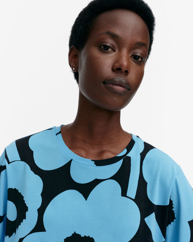 The Tunnit t-shirt is made of organic cotton jersey and it has a relaxed, straight fit. The t-shirt features the Unikko pattern and an O-neck with a self-fabric finish.