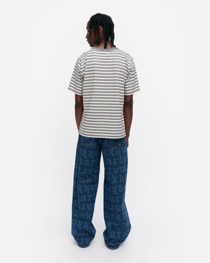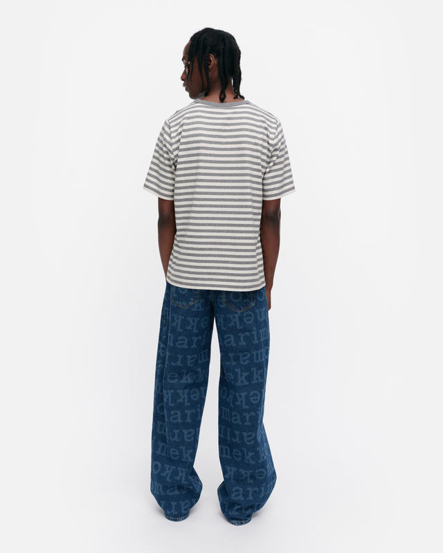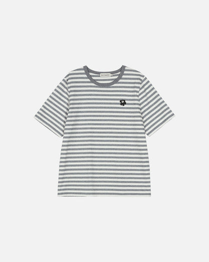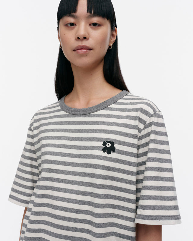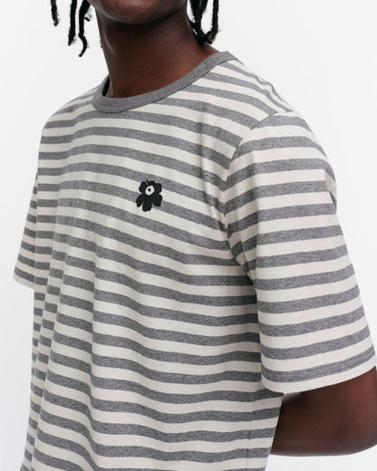 The unisex fit t-shirt is made of organic cotton jersey, and it features the Tasaraita pattern as well as the small Unikko flower, which is printed in the front. The t-shirt has a ribbed O-neck.