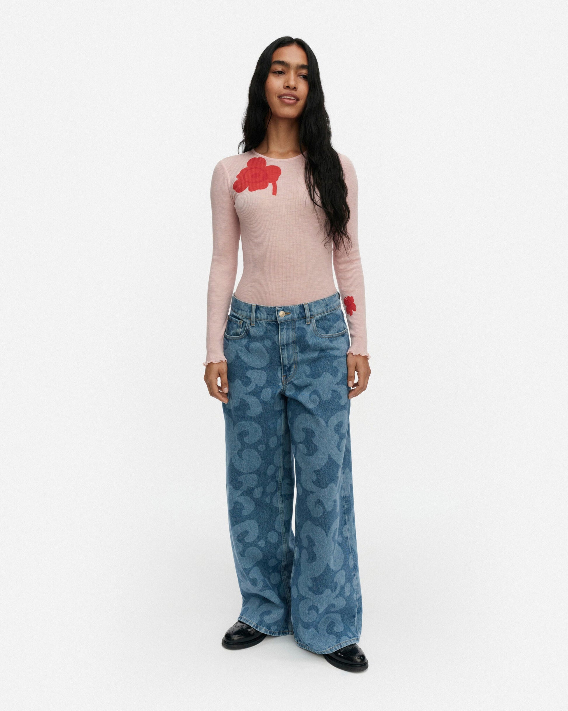 The used indigo Maridenim Loose jeans are made of non-stretch cotton denim in the Keidas pattern. The 5-pocket jeans have a slightly lowered waist and crotch, a relaxed fit, and wide, full-length legs. The jeans have Marimekko jean buttons and the Marimekko jean label in the back, which is made of FSC-certified jacron-material.