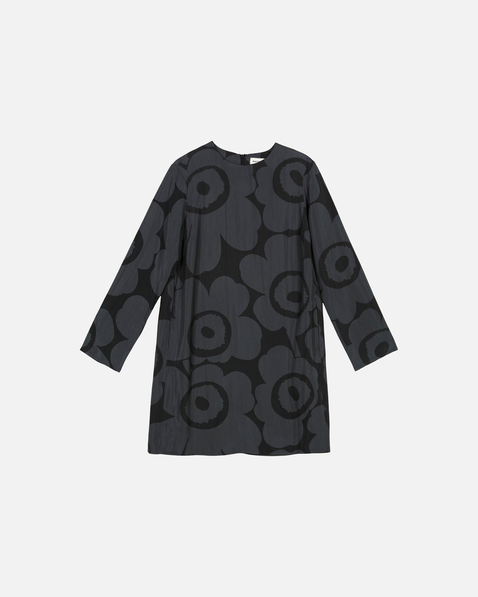 The Hienous dress has a slim, straight fit and it features the Unikko pattern. The dress has a small O-neck and a concealed zipper in the central back seam. The long slim sleeves have elbow darts that give the dress a more fitting shape. The side seams have been moved forward slightly, and they feature pockets. The dress comes with a narrow D-ring belt.
