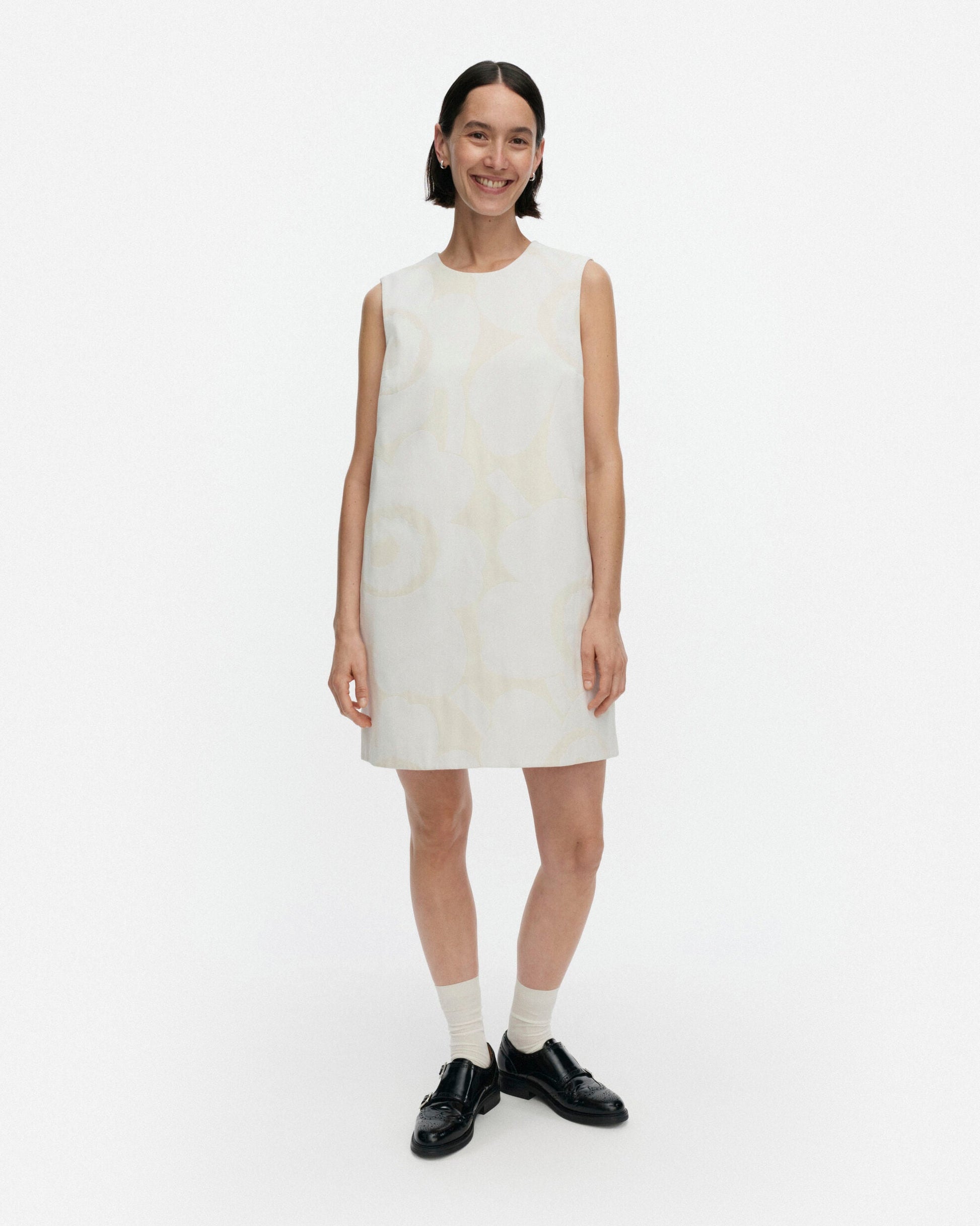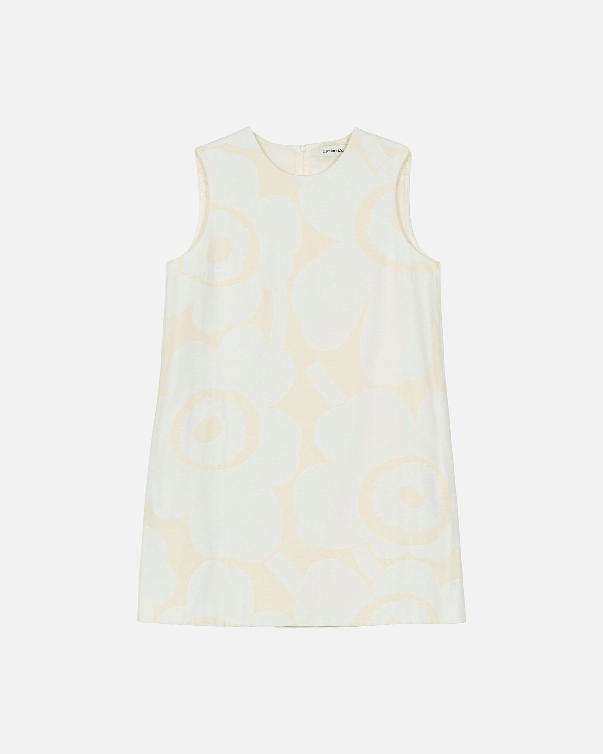 The sleeveless Hahmo dress has a slim, A-line fit and it features the jacquard knit Unikko pattern. The dress has an O-neck with a concealed zipper in the central back seam, side seam pockets, and bust darts that give the dress a more fitting shape. The dress is lined.