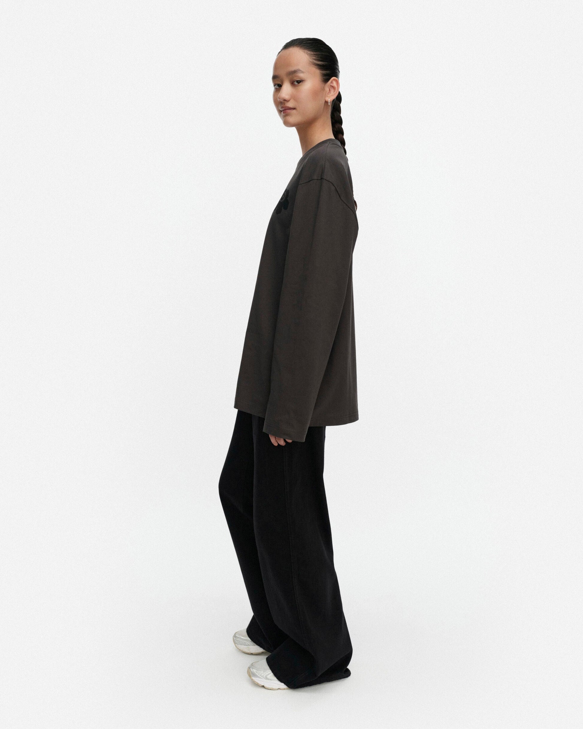 The Biitti top has a unisex fit. The long-sleeved top features the printed Unikko flower on the left chest and a ribbed O-neck.