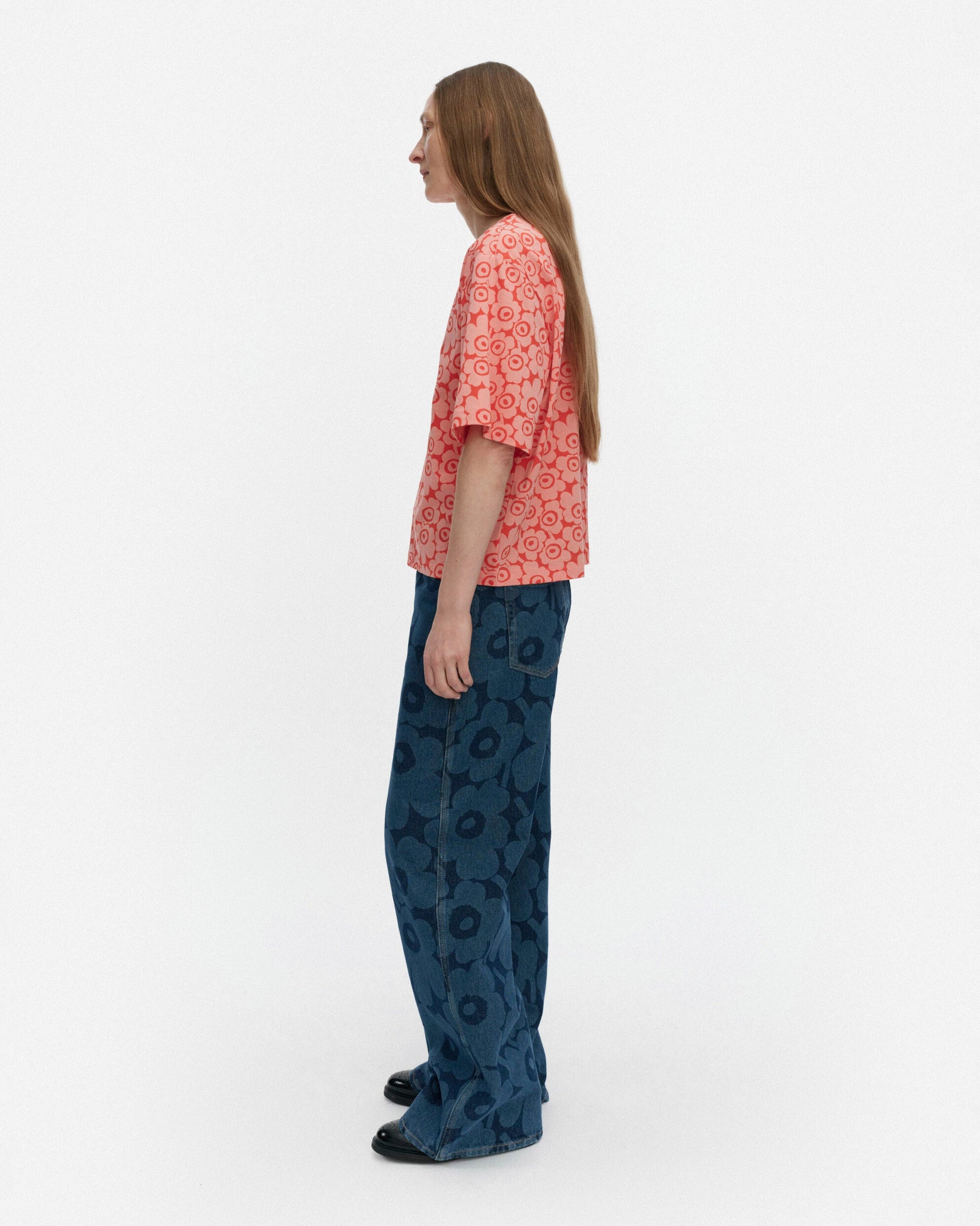 The Juulia t-shirt has an oversized, straight fit. The t-shirt features the Unikko pattern, a ribbed O-neck, and short, loose sleeves that are dropped at the shoulders.