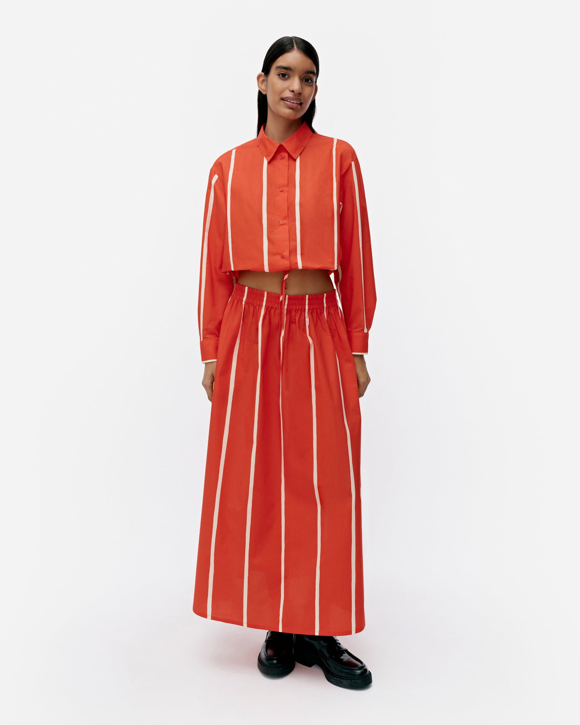 The Buklee skirt is made of organic cotton poplin, and it has a relaxed, A-line fit. The skirt features the Puhveli pattern, which is printed in Helsinki. The skirt has an elastic waistband and side seam pockets.