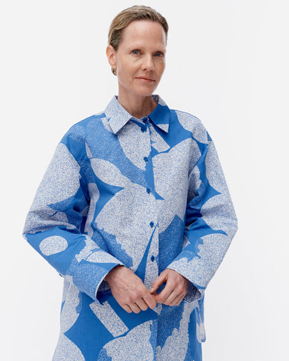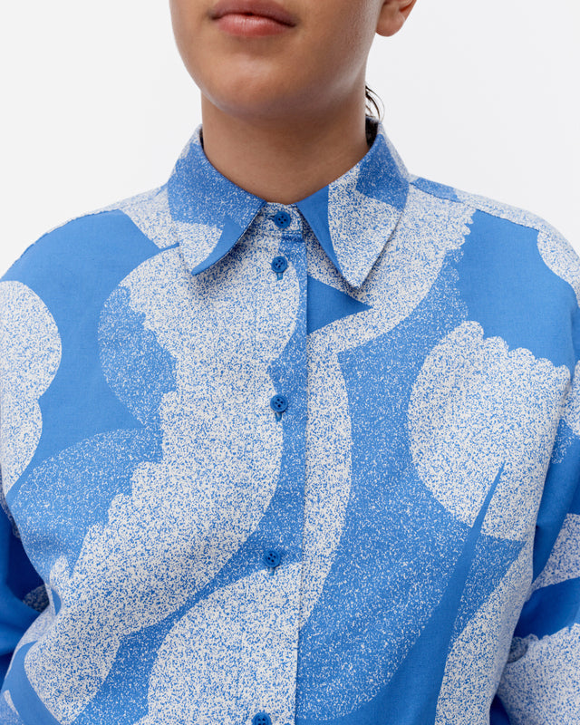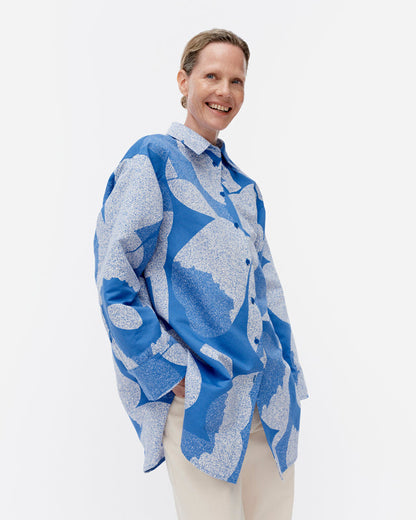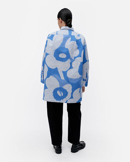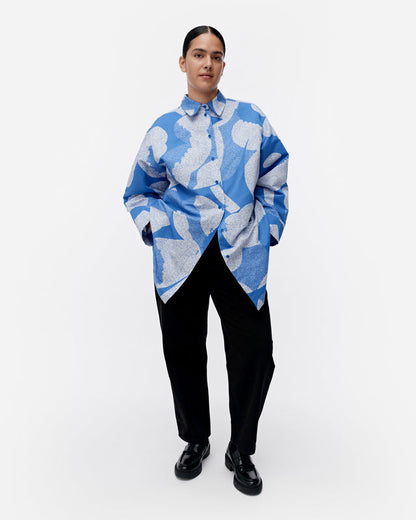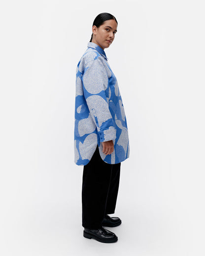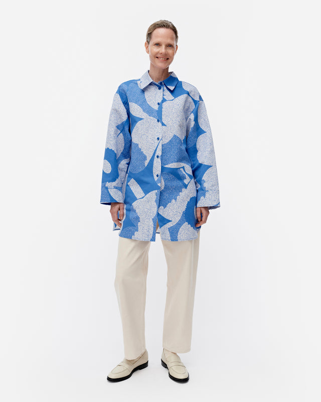 The Heitto button-up shirt is made of a cotton and linen blend twill, and it has an oversized, straight fit. The Unikko pattern fabric is printed in Helsinki. The shirt has a button closure, a back yoke seam with pleats, and a curved hem with side slits. The cuffed sleeves have slits and button closures.