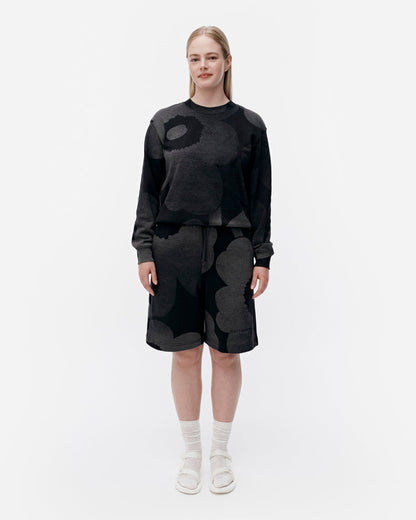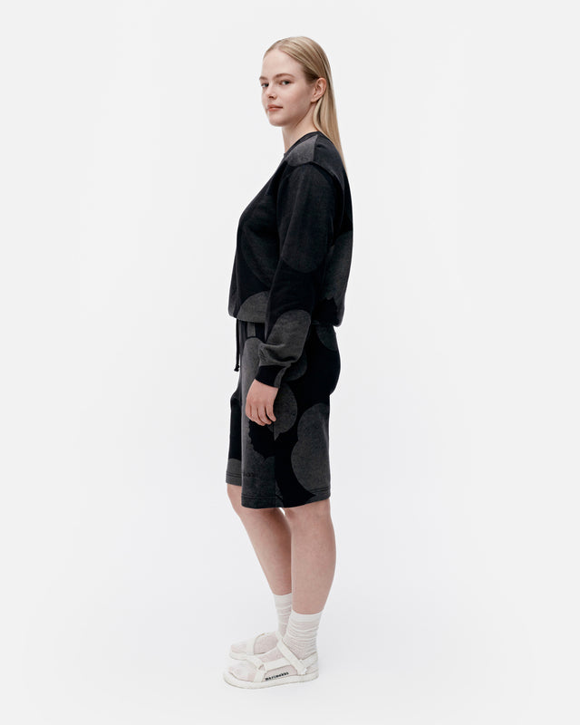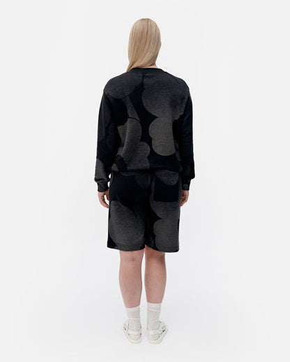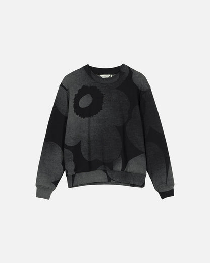 The Leiot sweatshirt is made of organic cotton French terry, and it has a relaxed fit. The sweatshirt features the Unikko pattern and the embroidered Marimekko logo in the front. The sweatshirt has a ribbed O-neck and wide ribbing at the sleeve ends and hemline. br/>