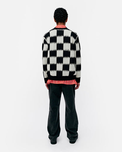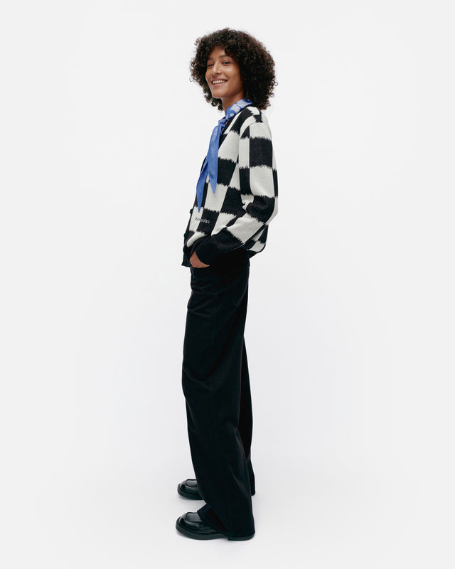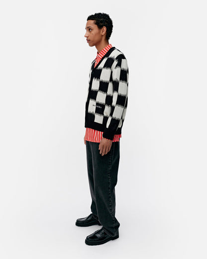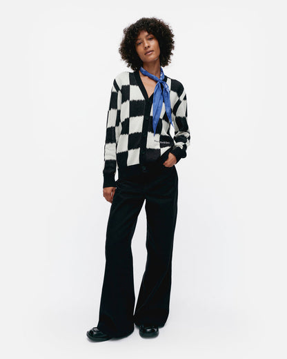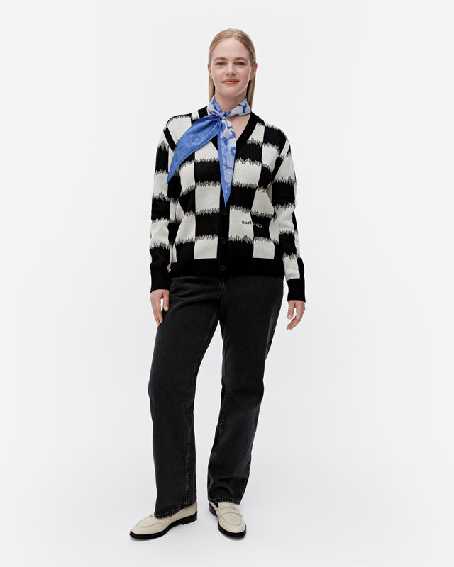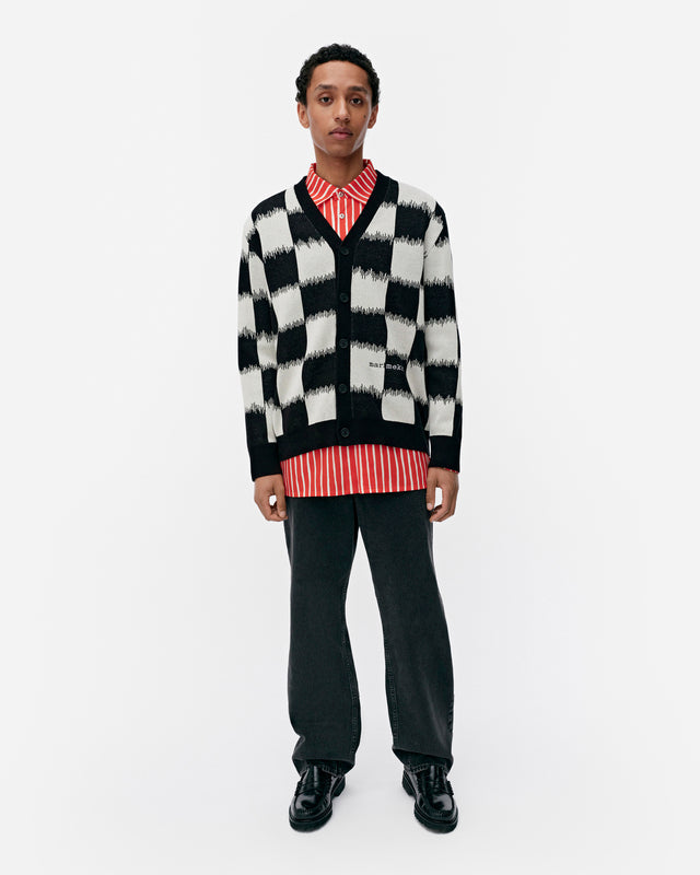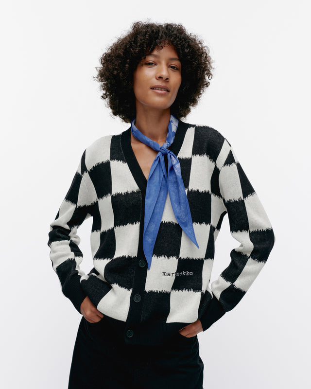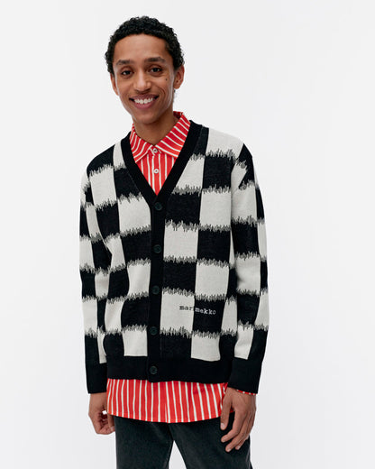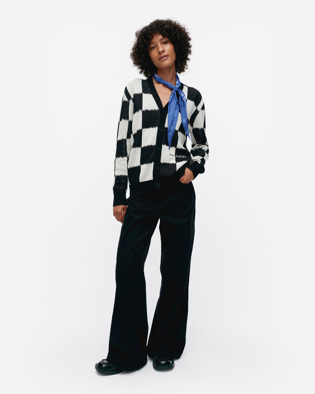 The Suuruus knitted cardigan is made of a cotton blend, and it has a relaxed, straight fit. The cardigan features the jacquard knit Jäkälä pattern, and it has a V-neck, a button closure, and the embroidered Marimekko logo in the front near the left hemline. The sleeve ends and hemline have wide ribbing.