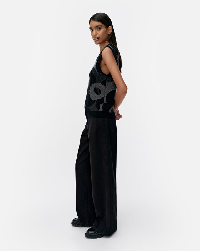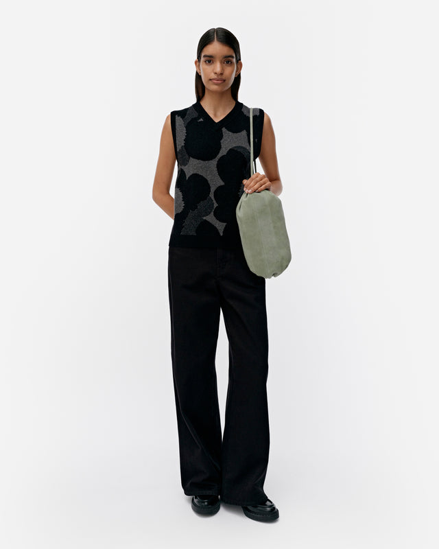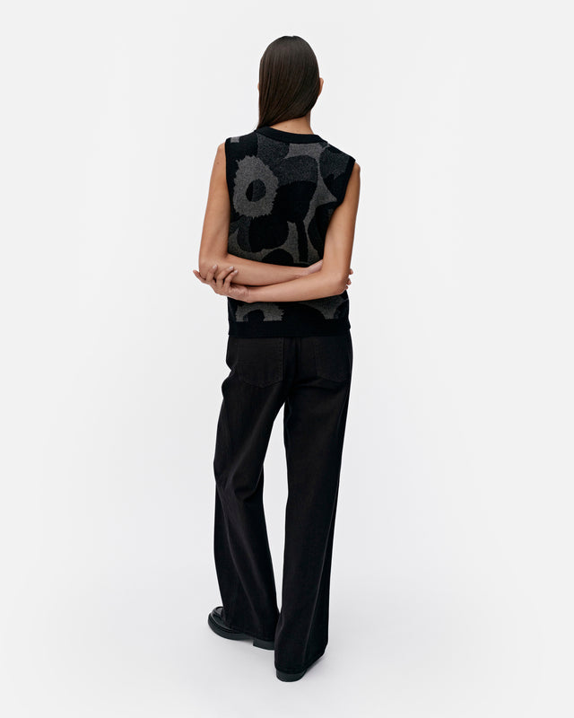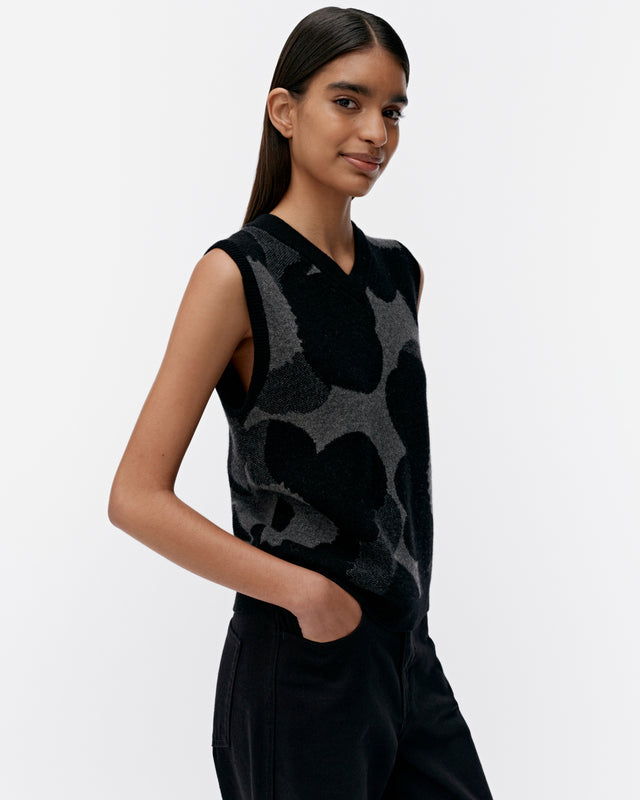 The Joukko knitted vest is made of a cashmere and wool blend, and it has a slim, straight fit. It features the jacquard knit Unikko pattern, a double-ribbed V-neck and sleeve openings, and wide ribbing at the hemline.