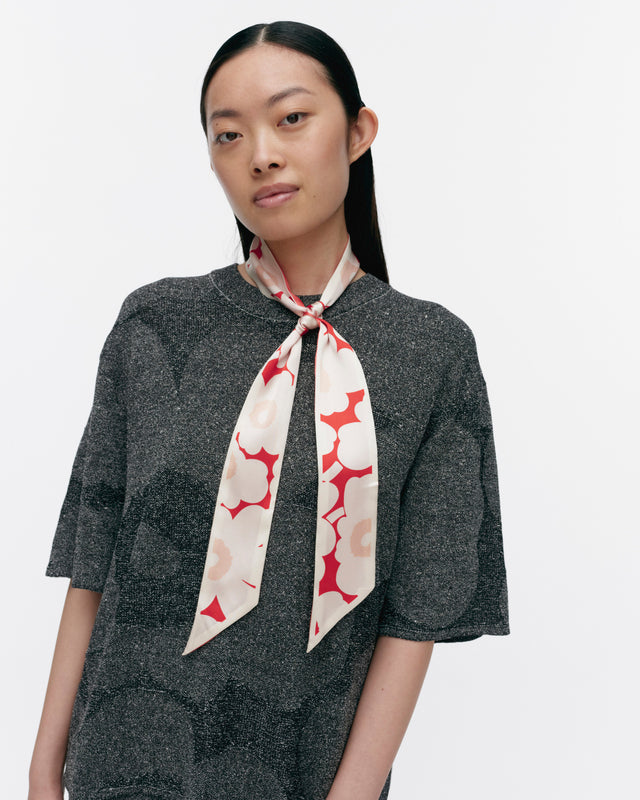 The narrow Jåvva silk scarf features the Unikko pattern.