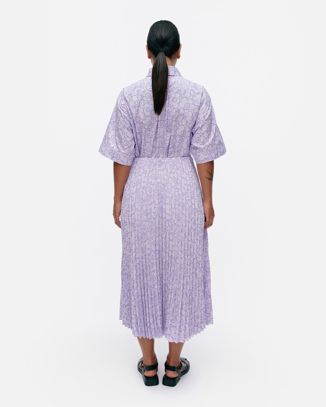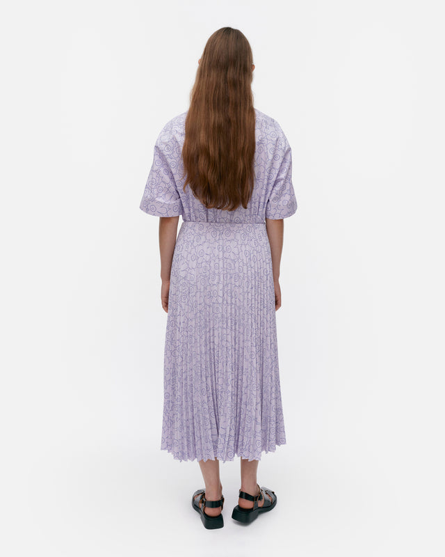 The Myy plissée skirt has a relaxed, A-line fit and it is made of dense recycled polyester in the Piirto Unikko pattern. The skirt has a wide hem and an elastic waistband.