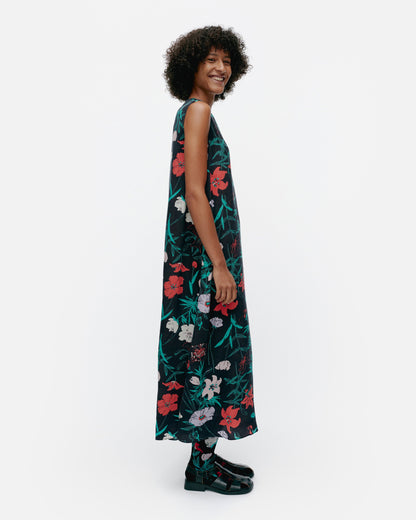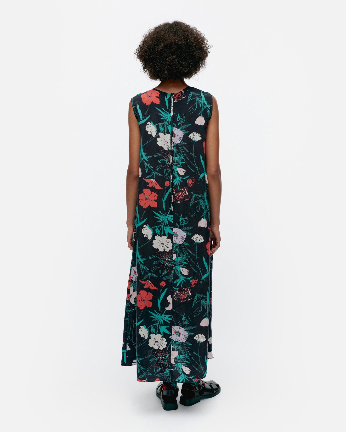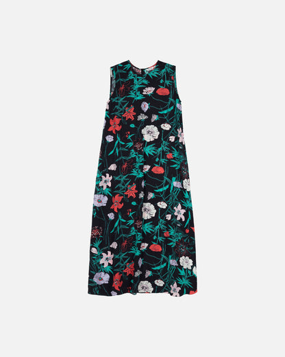 The Migot cupro dress has a slim, A-line fit and it is printed in the Perenna pattern. The sleeveless dress has a concealed zipper with long ribbon pullers at the back neckline and pockets at the side seams.