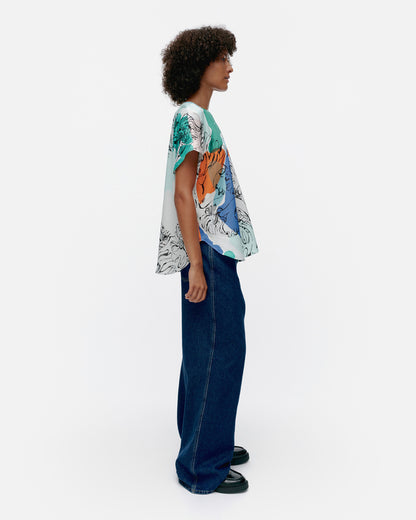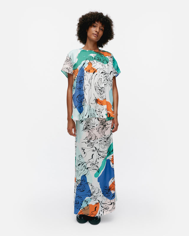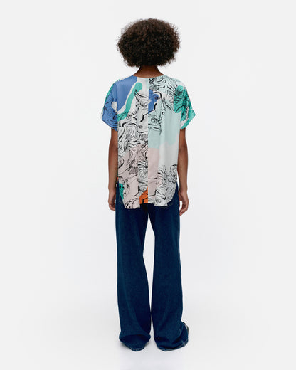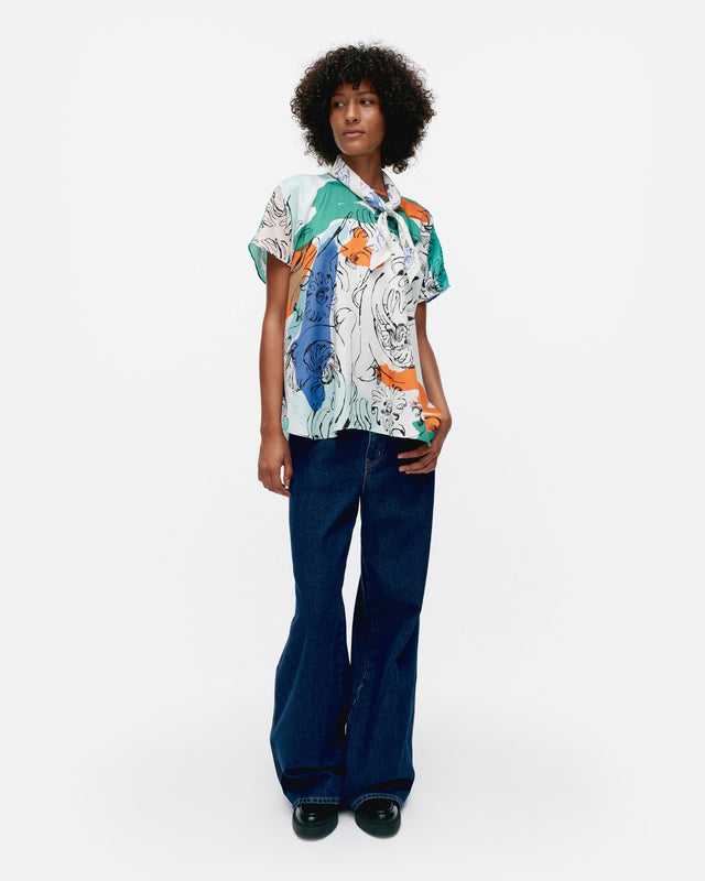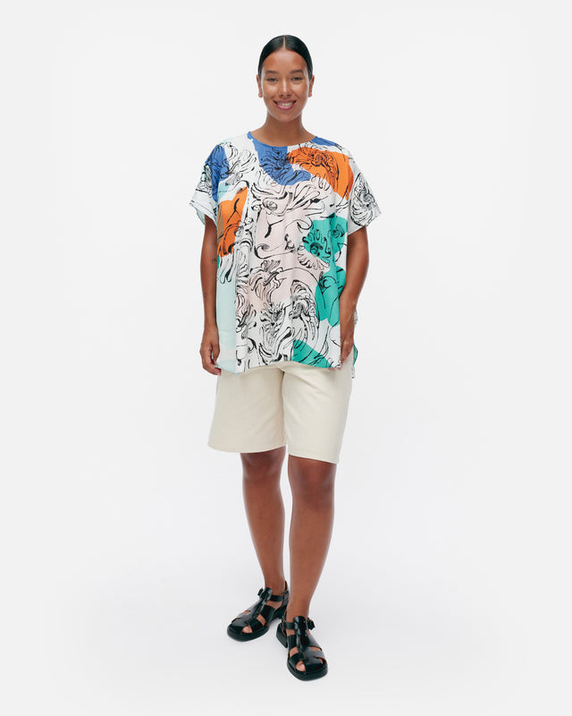The Herkkä top is made of a lyocell and viscose blend, and it has a relaxed, straight fit. The top features the Blombom pattern, an O-neck with a concealed zipper in the back seam, and short kimono sleeves. The hem has a curved cut.